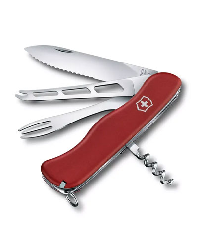 تیغه بزرگ با لبه موج دار / تیغه پنیر / چنگال فوندو | درب بطری / پیچ چوب پنبه / حلقه کلید / موچین / خلال دندان / چنگال فوندو